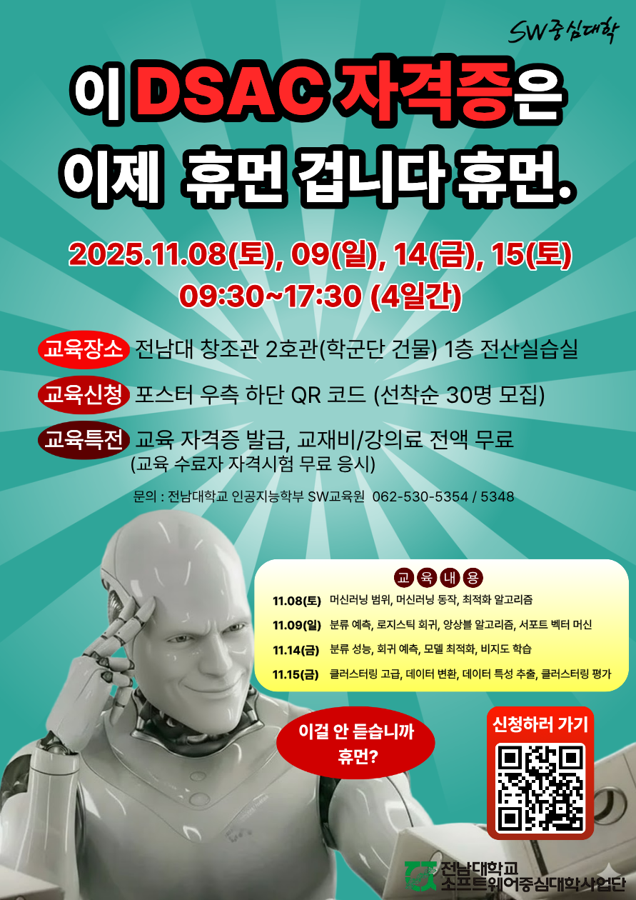 [교내프로그램] 전남대학교 RISE+데이터사이언티스트 자격증 과정(머신러닝과정) 수강생 모집