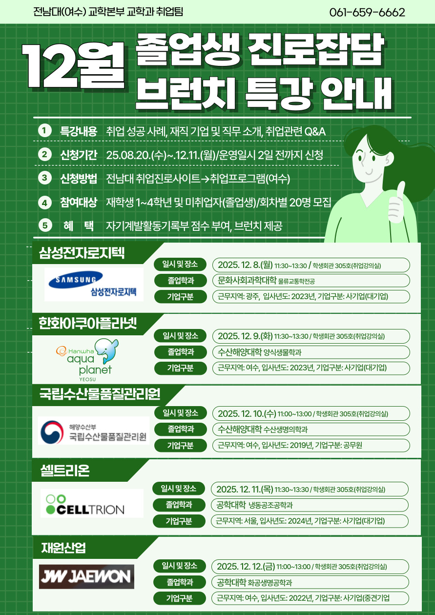 *신청방법: http://capd.jnu.ac.kr - 취업프로그램(여수) - 12월 졸업생 진로잡담 브런치 특강 안내