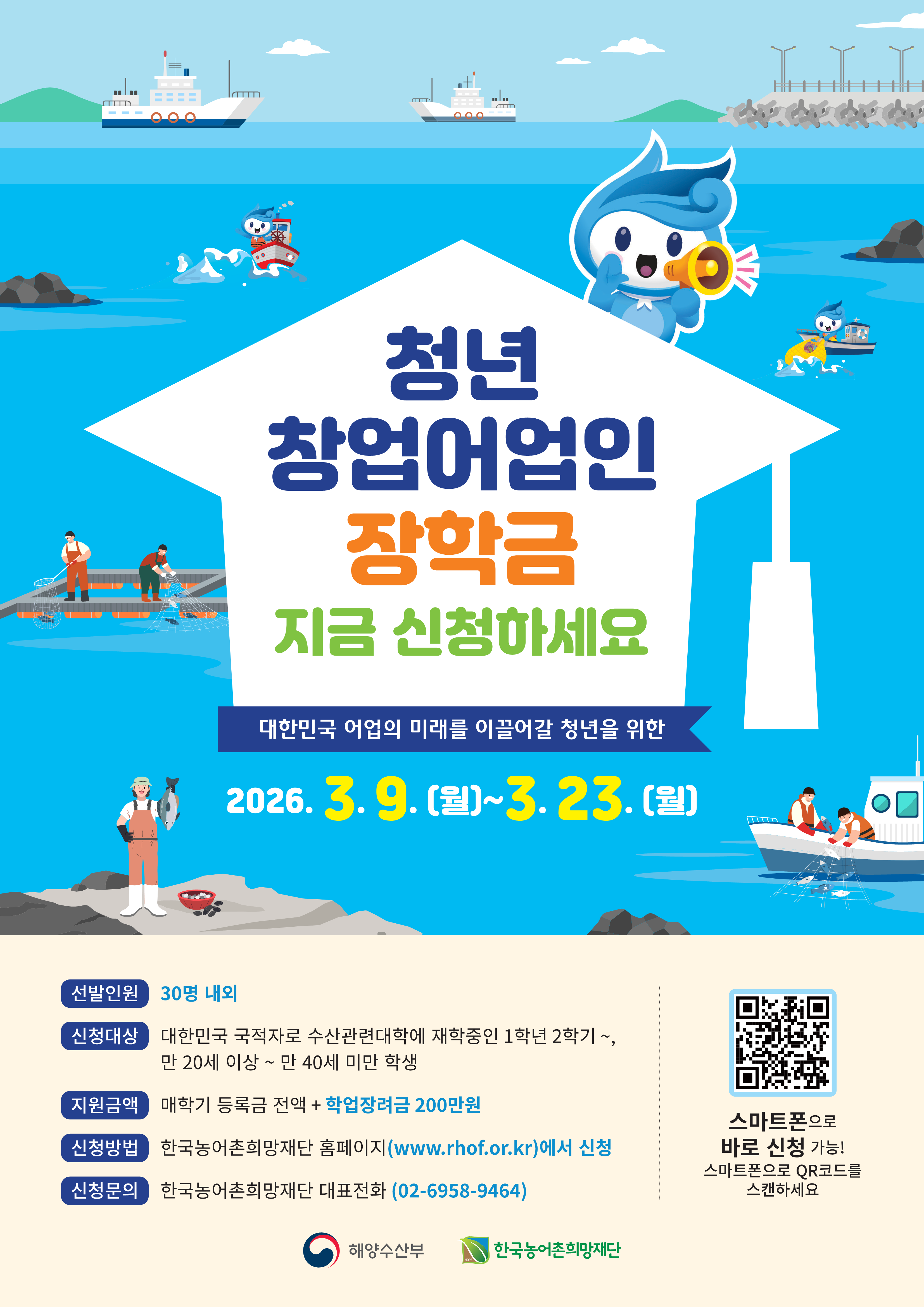 fnctId=bbs,fnctNo=59 글번호 971104 [장학] 2026년 1학기 해양수산부 청년창업어업인장학생 선발 안내 작성일 2026.02.24 수정일 2026.02.24 작성자 정세희 조회수 29 첨부파일 첨부파일이(가) 없습니다. 다음글 2026학년도 1학기 학교버스 운행 안내 정세희 2026-02-27 17:39:07.0 이전글 [대학생활] 2026학년도 신(편)입생 학생증 발급 계획 안내 정세희 2026-02-23 14:42:07.0