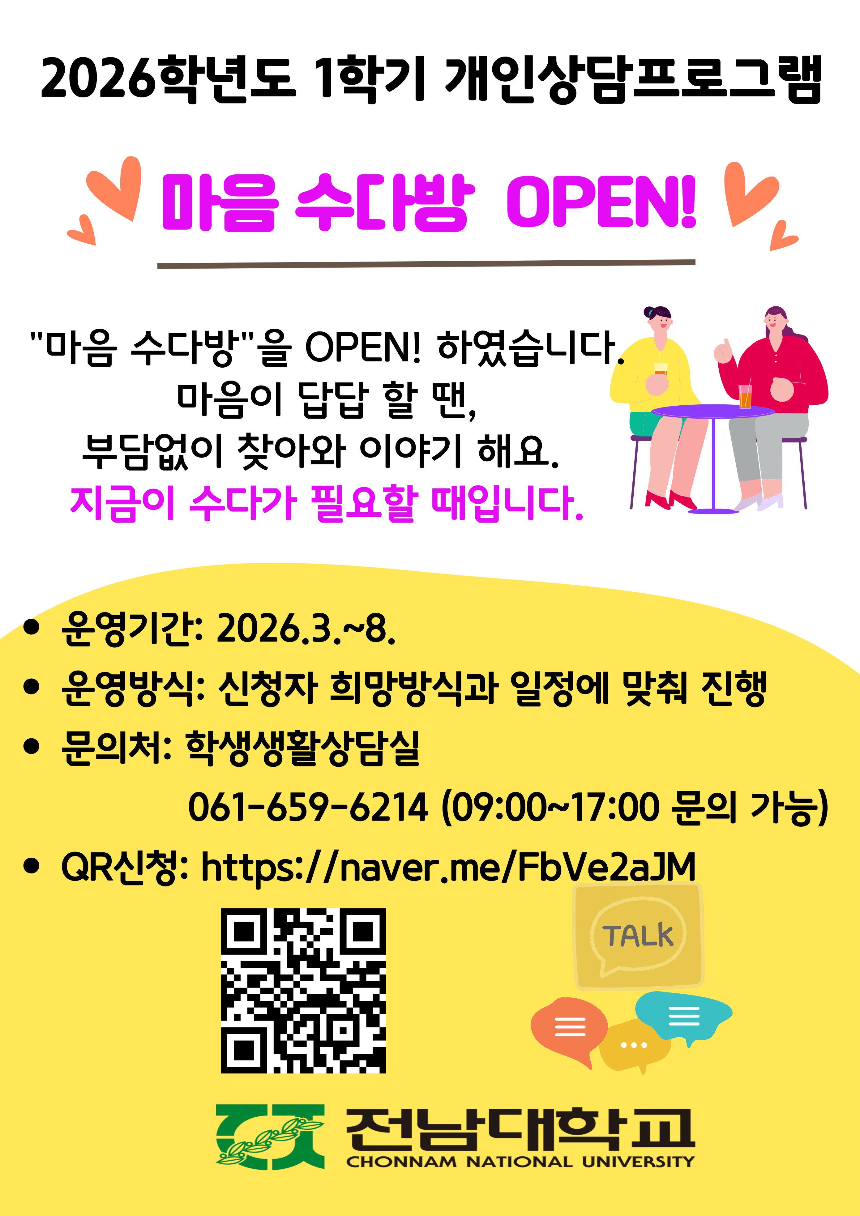 fnctId=bbs,fnctNo=59 글번호 975653 2026학년도 1학기 개인상담프로그램 「마음수다방」OPEN 작성일 2026.03.11 수정일 2026.03.11 작성자 정세희 조회수 16 첨부파일 첨부파일이(가) 없습니다. 다음글 [교내프로그램] 2026학년도 1학기 학습법 프로그램 「한글로벌」 참가자 모집 정세희 2026-03-11 18:04:48.0 이전글 [교내프로그램] 2026학년도 1학기 이뭣고-여수새싹 프로그램 참가 모둠 모집 정세희 2026-03-11 16:17:45.0