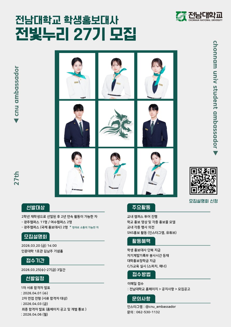 fnctId=bbs,fnctNo=59 글번호 975657 2026학년도 제27기 학생홍보대사 「전빛누리」선발 안내 작성일 2026.03.11 수정일 2026.03.11 작성자 정세희 조회수 15 첨부파일 3. [서식 2] 개인정보 수집·이용 동의서(학생홍보대사).hwp 미리보기 2. [서식1] 전남대학교 27기 학생홍보대사 지원서 등.hwp 미리보기 1. 전남대학교 제27기 학생홍보대사 선발 공고문.hwp 미리보기 다음글 국립대학육성사업 2026학년도 교수학습 프로그램 비상 리워드 안내 정세희 2026-03-11 18:23:47.0 이전글 [교내프로그램] 2026학년도 1학기 학습법 프로그램 「한글로벌」 참가자 모집 정세희 2026-03-11 18:04:48.0